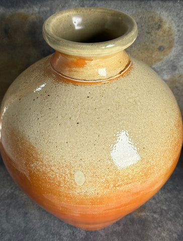 This wood fired vase is 13" tall and 9" wide. It shows the beautiful colors of the flames in the firing.